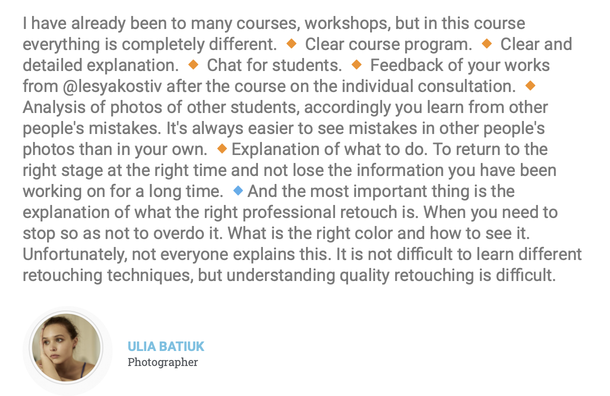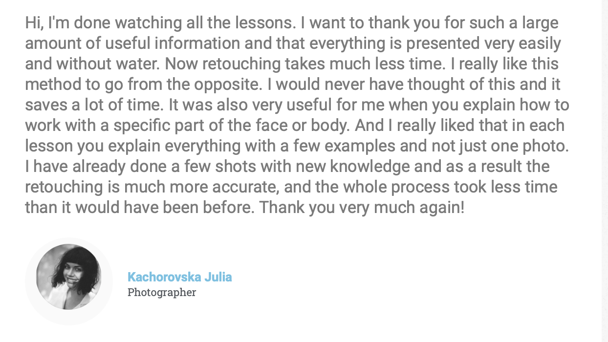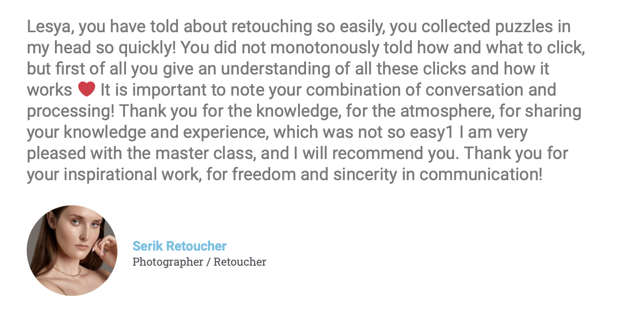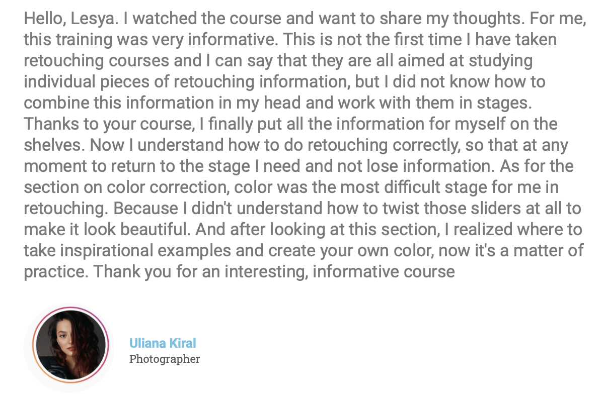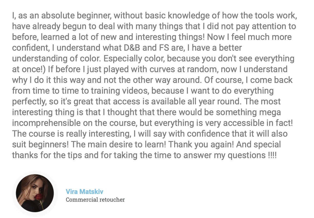 Result – Master all retouching tools, layers, masks, retouching techniques. You know how to retouch skin, makeup, lips, eyes, nails, hair, body, clothes, background.